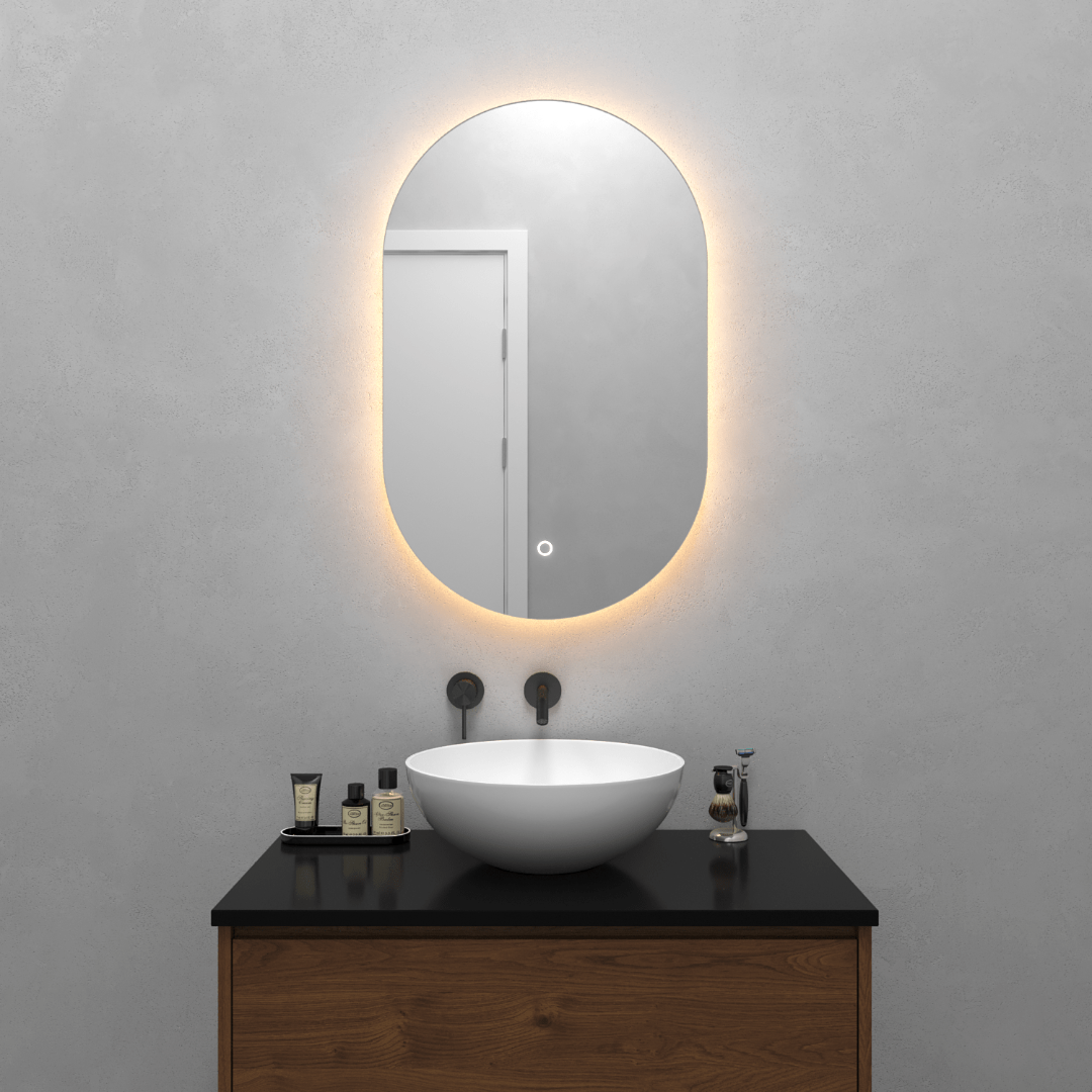 Безрамное зеркало овальной (капсульной) формы с контурной (тыльной) тёплой подсветкой, свет 3000К.